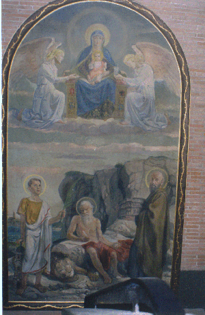 | Ora la statua di Sant'Eufemia ha trovato degno ricetto, insieme a quella di S. Vito, nell'Archivio Museo della Città di Fiume presente nel Quartiere Giuliano dalmata di Roma. Per restare nell'ambito della Chiesa di San Marco Evangelista voglio qui riportare anche la pala della Madonna dell'Esule, olio opera del pittore zaratino Andrea Fossombrone, rappresenta la Madonna Eufrasiana di Parenzo con ai lati due angeli: uno le offre le preghiere e l'altro, in un'ampolla, le lacrime dei profughi. La pala una volta era situata dietro l'altare principale ed ora, nella nuova chiesa, è relegata nella canonica della nuova chiesa: |