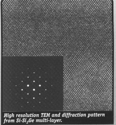 Fig. 2.10: un reticolo di Si-Si2Ge: si vede sia l'immagine nello spazio reale di un piano del campione (che tuttavia non è l'immagine del reticolo atomico, ricordiamo che la risoluzione TEM è "solo" 1 nm, ma della convoluzione di questo col fascio elettronico), sia l'immagine del pattern di diffrazione (in pratica la trasformata di Fourier della precedente). Questa evidenzia le periodicità del campione, in quanto i punti chiari corrispondono a dei picchi di massimo valore dell'intensità dei fasci diffratti dal campione, e cioè si hanno dove i vari fasci diffratti, provenienti dai vari atomi, interferiscono in maniera costruttiva, sommandosi; (si notano anche le diverse intensità in corrispondenza dei vari punti).