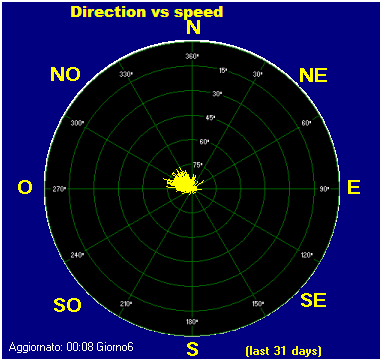 Velocitŕ massima di raffica = 22.2 km/h from 315°( NW) giorno 05 tempo 12:52