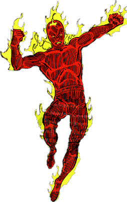 Poteri: Può infiammare il suo corpo a temperature altissime, e utilizzare il calore per volare e lanciare fiamme nella forma desiderata. E' immune agli effetti delle fiamme, può assorbire calore e modificare la temperatura circostante. Quando la sua fiamma raggiunge la massima intensità, genera un esplosione di energia pari alla forza di una stella Nova.